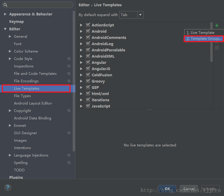 选择 Live Template,点击右侧的+号,选择 Template Group