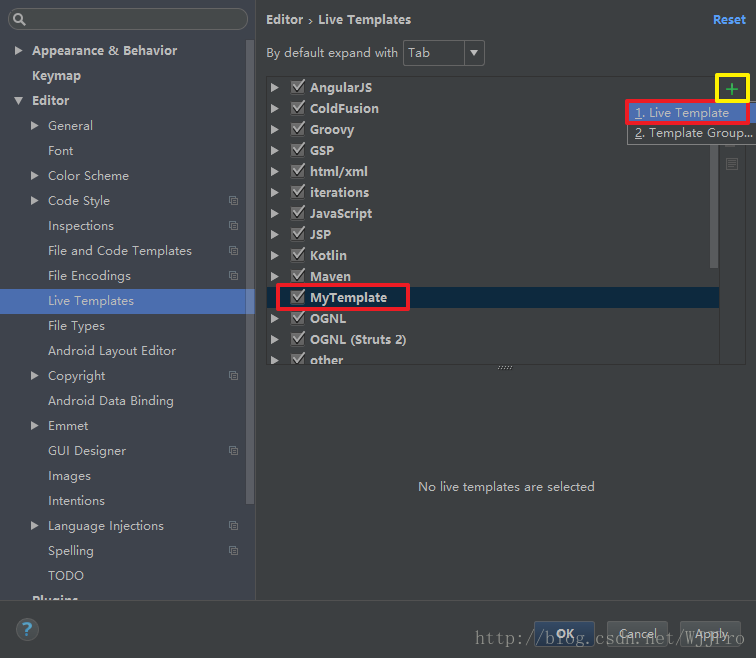 选中刚创建的 Template Group,再次点击右侧的+号,选择Live Template