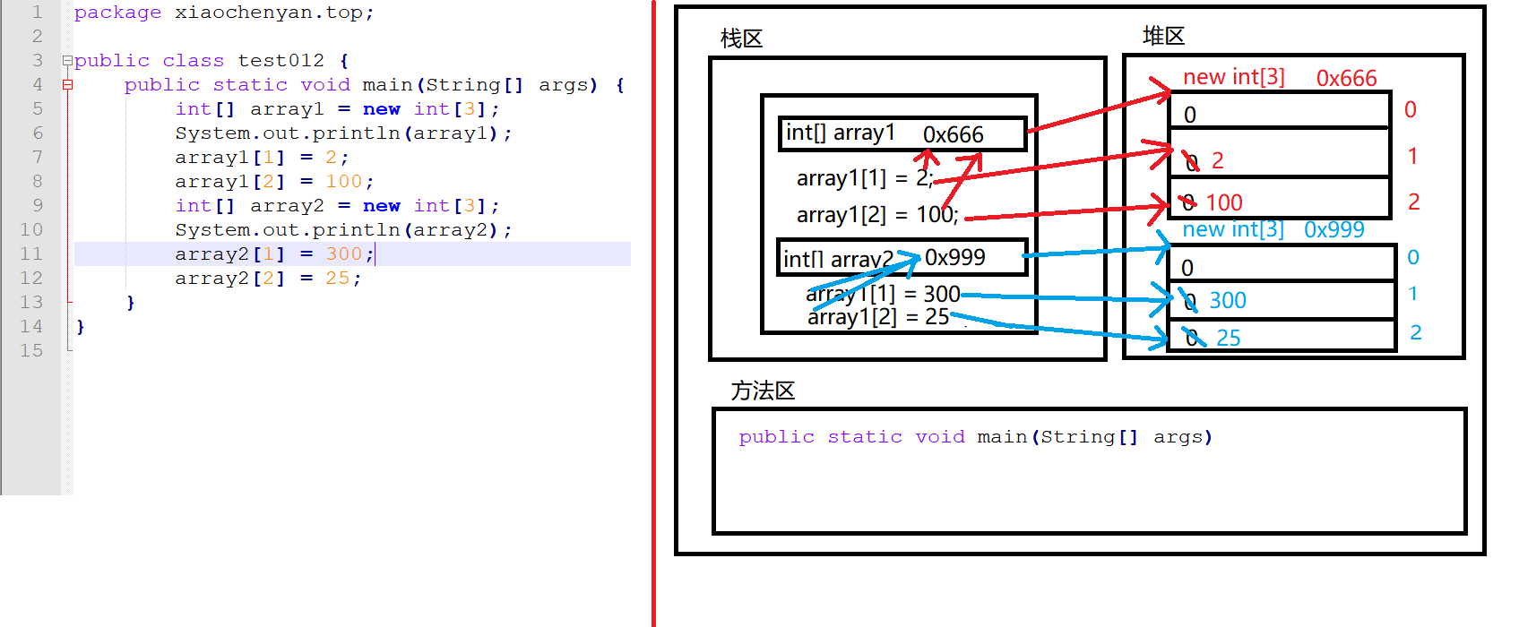 public class test012 { public static void main(String[] args) { int[] array1 = new int[3]; System.out.println(array1); array1[1] = 2; array1[2] = 100; int[] array2 = new int[3]; System.out.println(array2); array2[1] = 300; array2[2] = 25; } }