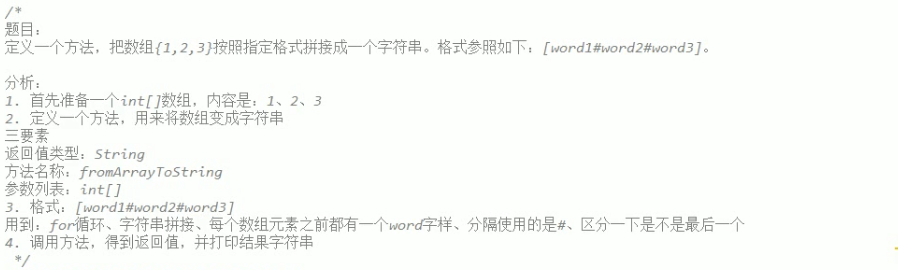 | public class demo13{ public static void main(String[] args) { int[] intArray = {1,2,3,4}; String str = pingJieZiFuChuan(intArray); System.out.println(str); } public static String pingJieZiFuChuan(int[] intArray) { String str = "["; for (int i = 0; i < intArray.length; i++) {