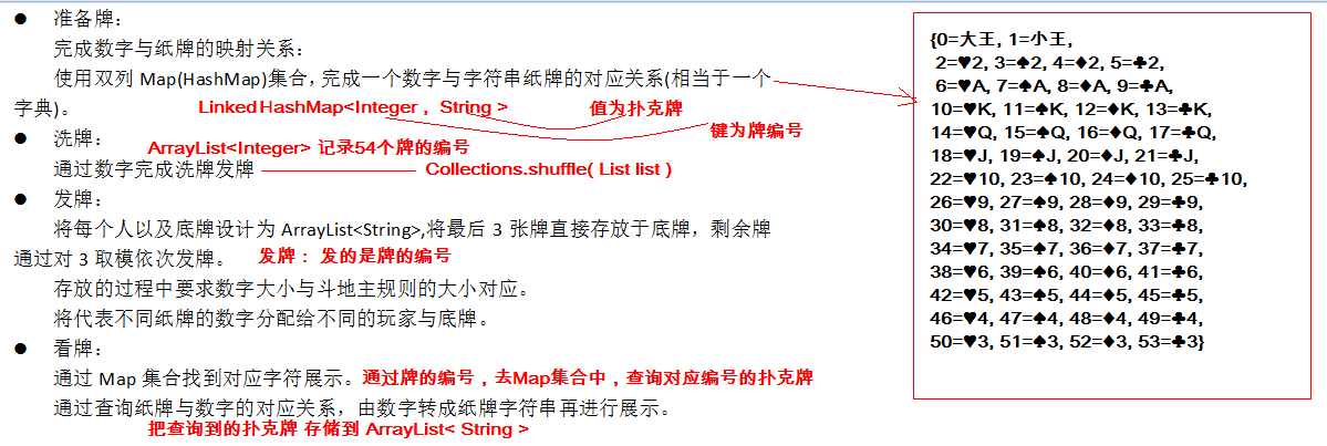 public class DouDiZhu { public static void main(String[] args) { HashMap<Integer,String> poker = new HashMap<>(); ArrayList<Integer> pokerIndex = new ArrayList<>(); List<String> colors = List.of("♠", "♥", "♣", "♦"); List<String> numbers = List.of("2", "A", "K", "Q", "J", "10", "9", "8", "7", "6", "5", "4", "3"); int index = 0; poker.put(index,"大王"); pokerIndex.add(index); index++; poker.put(index,"小王"); pokerIndex.add(index); index++; for (String number : numbers) { for (String color : colors) { poker.put(index,color+number); pokerIndex.add(index); index++; } }