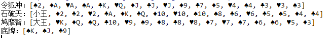 lookPoker("刘德华",poker,player01); lookPoker("周润发",poker,player02); lookPoker("周星驰",poker,player03); lookPoker("底牌",poker,diPai); }